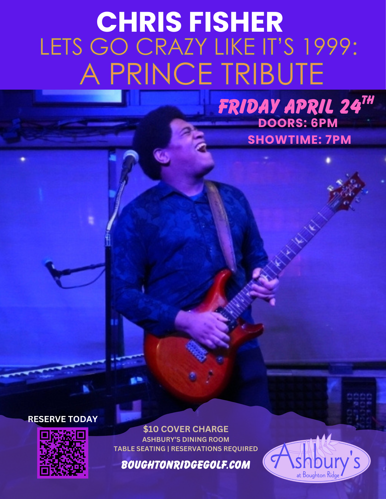 Join us at Ashbury’s in the Dining Room on Friday, April 24th for an unforgettable night as Chris Fisher brings his high-energy Prince Tribute Show to the stage.